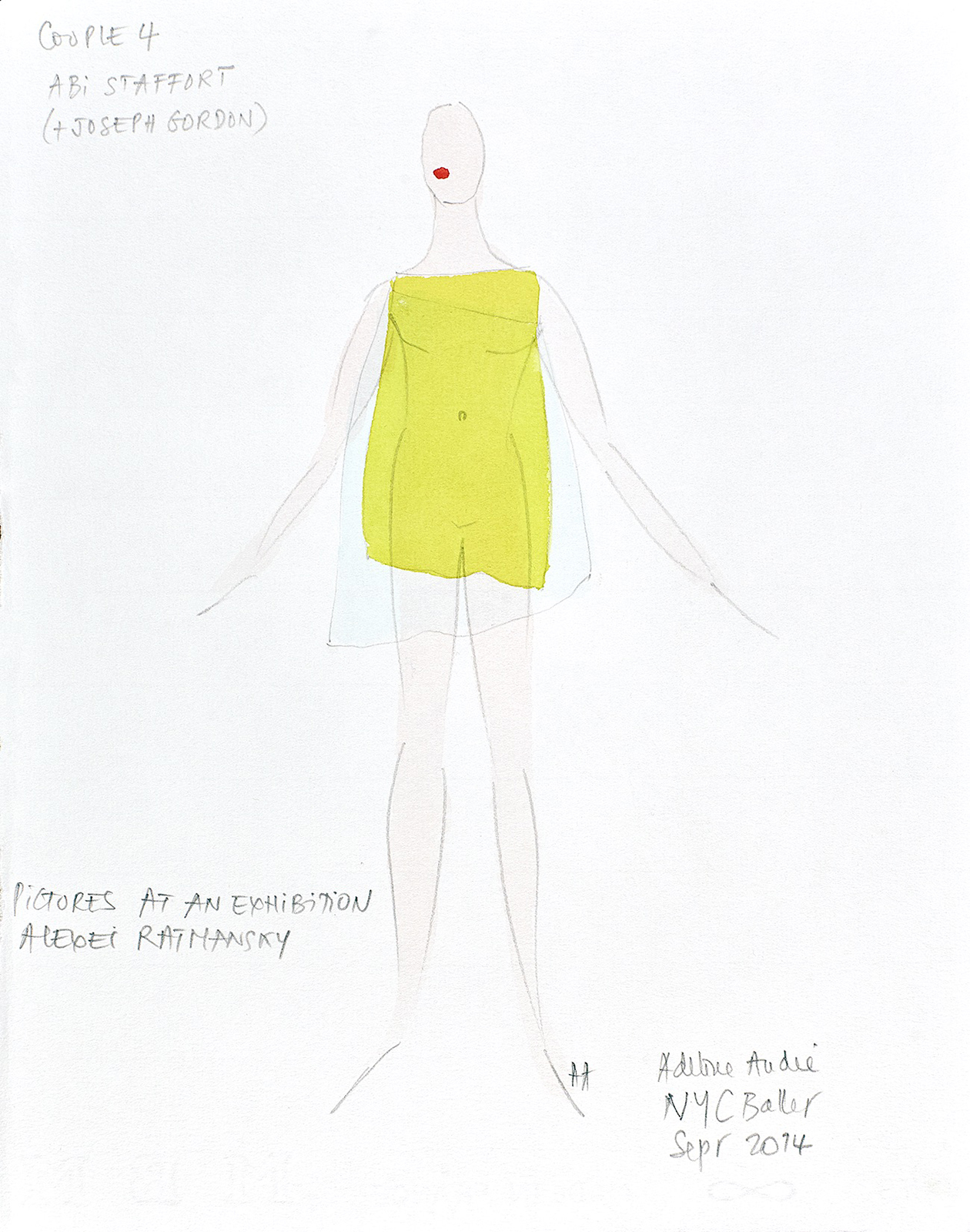 Dessins des costumes créés par Adeline André pour « Pictures at an Exhibition », ballet d’Alexei Ratmansky, musique de Moussorgsky, produit par NYCITYBALLET en septembre 2014, ensuite par PNB à Seattle en juin 2017.