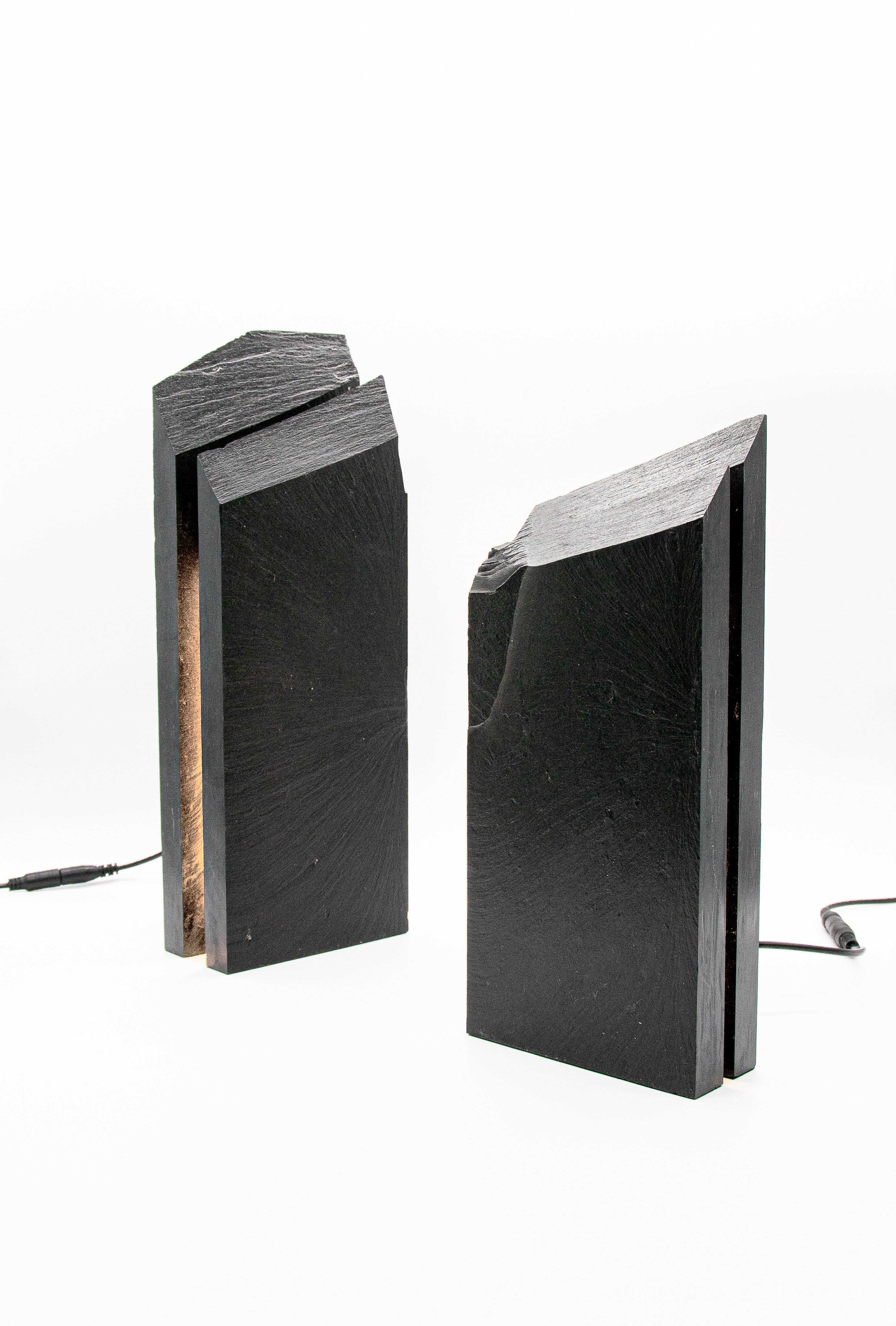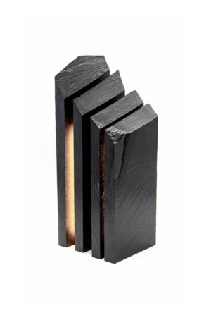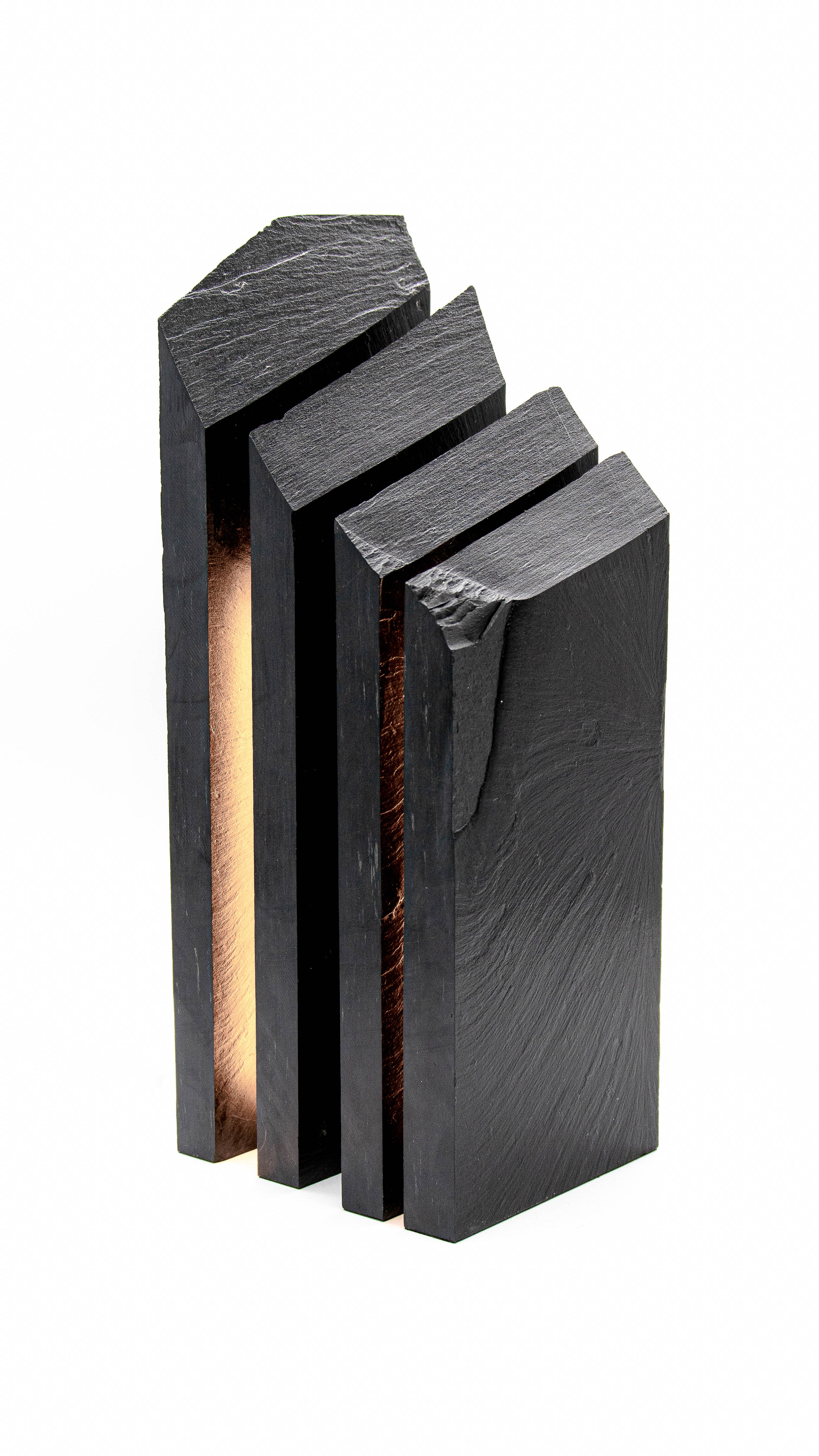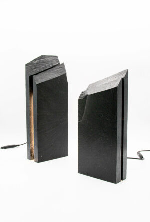 Le clivage de l’ardoise crée un veinage qui vient texturer la surface, témoin du geste ancestral, tandis que les angles arrondis accentuent les multiples strates de cette roche mille-feuilles. Lorsqu’ils sont éteints, ils se transforment en sculptures brutes naturelles, des totems intemporels.