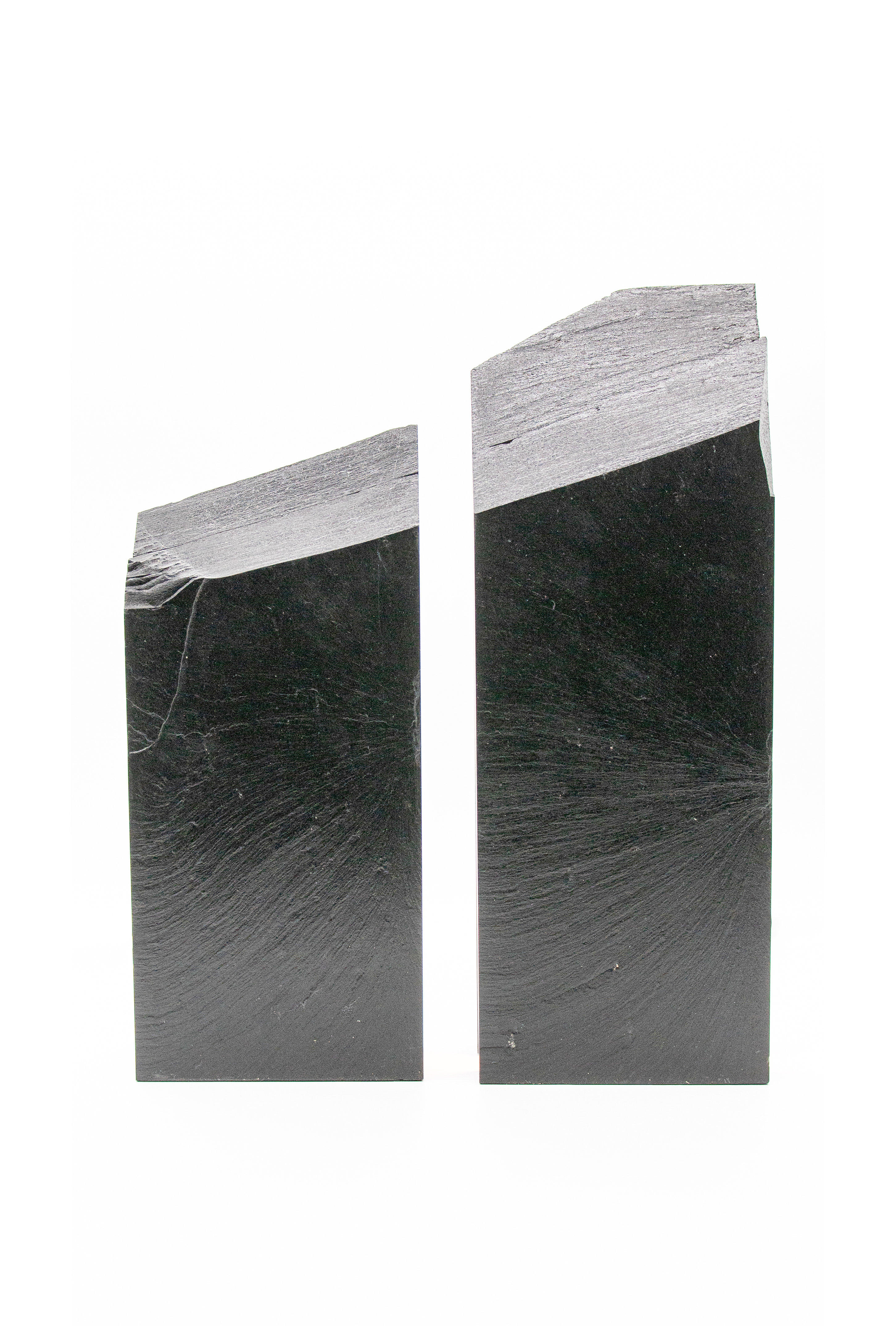 Nées d’un seul bloc d’ardoise des Pyrénées et effeuillées trois fois par le maître ardoisier, les Dyades forment un couple de lampes illustrant la remarquable capacité de l’ardoise à se fendre droit, témoignant du geste ardoisier. Au sommet des luminaires, une cassure naturelle sectionne le bloc, créant une texture nouvelle déjà présente avant l’entaille de l’ardoisier. Les Dyades peuvent fonctionner dans plusieurs compositions visuelles, à la guise du propriétaire.