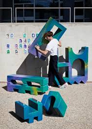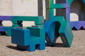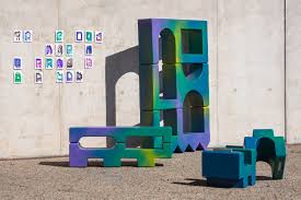 Suite à cette première phase d’esquisses, Riwan Coëffic traduit les qualités graphiques et les sensations du dessin au bic dans une série d’objets. Trois meubles naissent de ce principe : une étagère, un banc et une console. Souhaitant instaurer une relation au corps entre l’utilisateur et l’objet, le jeune designer imagine un mobilier massif, dont la plus grande pièce mesure un mètre quatre-vingts. Il transcrit la couleur et le grain des illustrations par de grands dégradés colorés sur les objets, soutenu par la texture particulière du polyuréthane pulvérisé. Très solide, ce matériau résiste aux chocs, à une utilisation extérieure et supporte la fonction d’assise. Les volumes des meubles étant imposants, ceux-ci sont divisés en deux ou trois parties, et s’emboitent grâce à des fermoirs en aluminium qui se cliquent les uns aux autres. En manipulant les différentes pièces, l’utilisateur ressent une sensation de satisfaction comparable à celle éprouvée lors du dessin des trames colorées. Avec malice et ingéniosité, Riwan Coëffic signe un projet de diplôme joueur, qui matérialise la spontanéité du dessin en une série de mobilier fonctionnel.