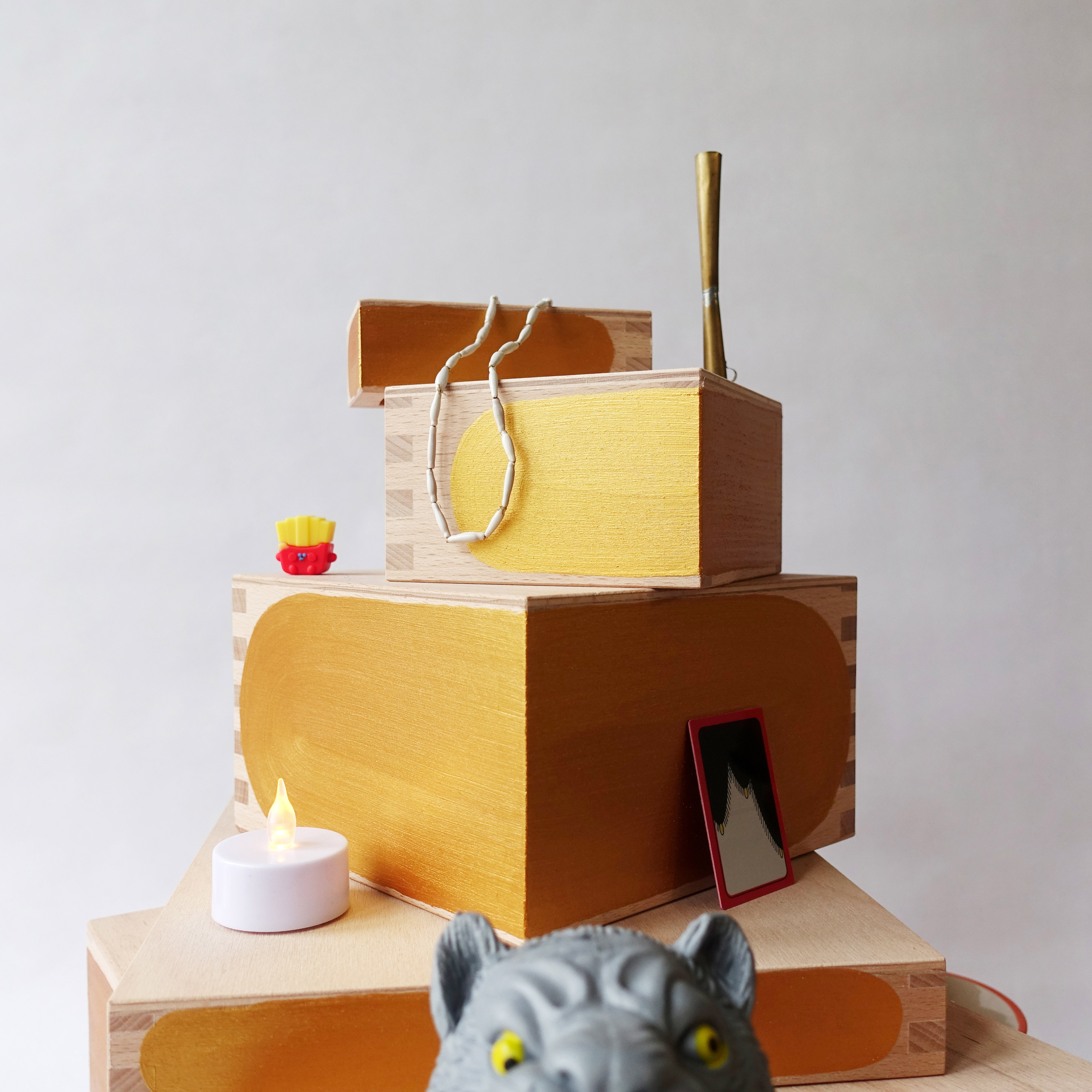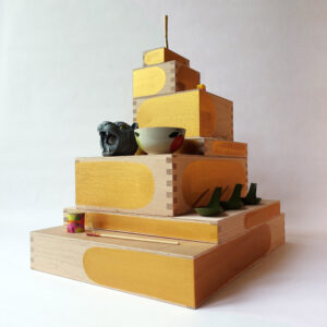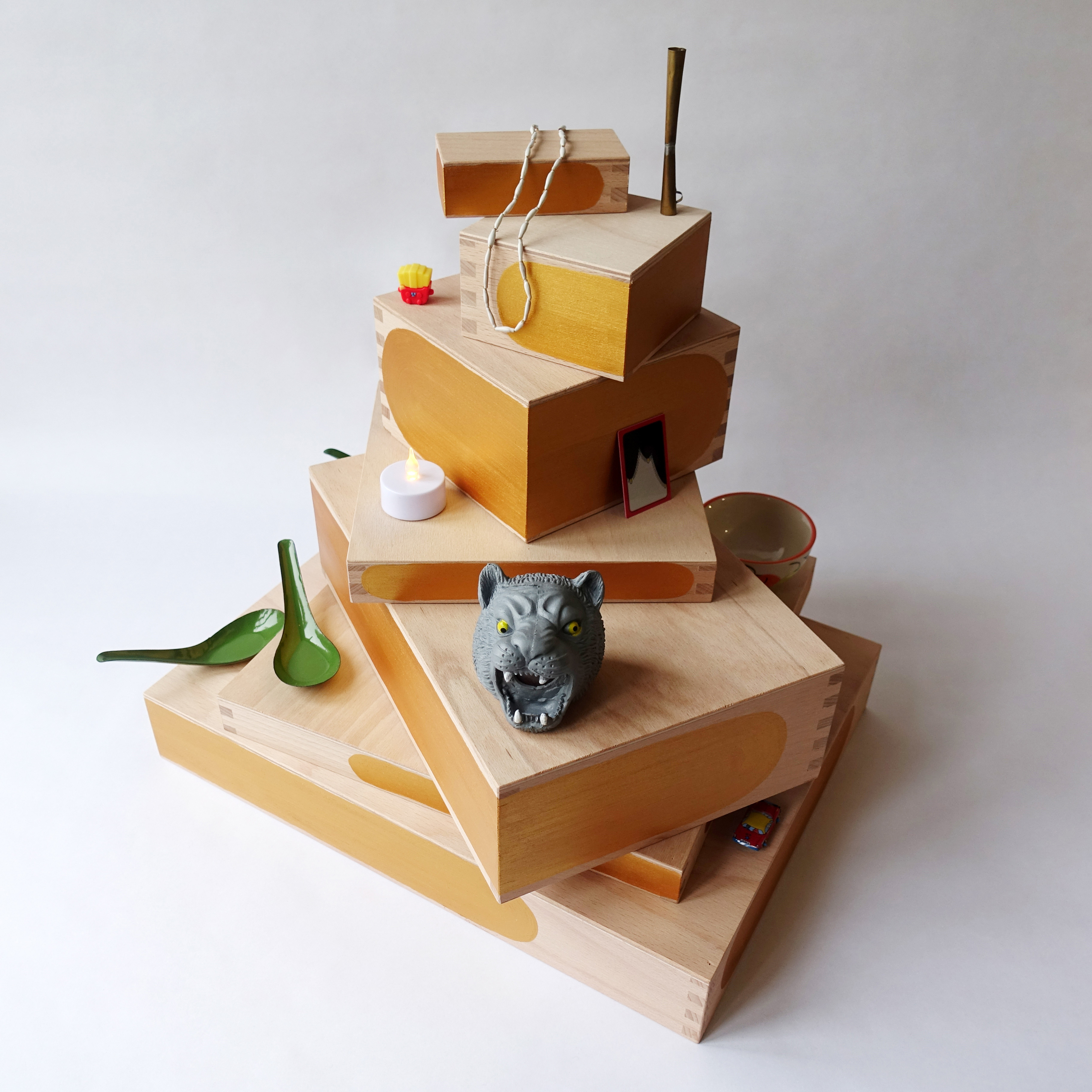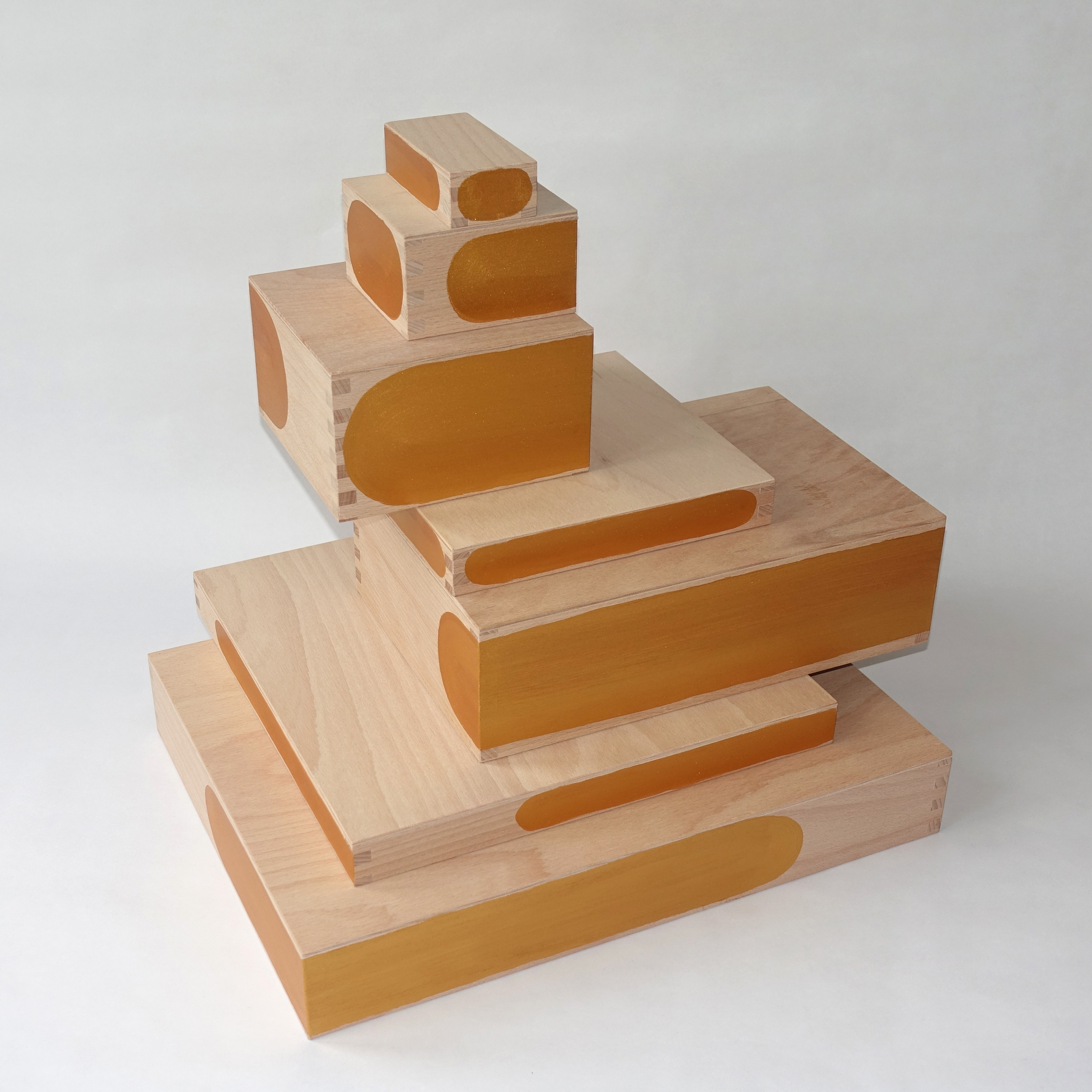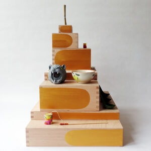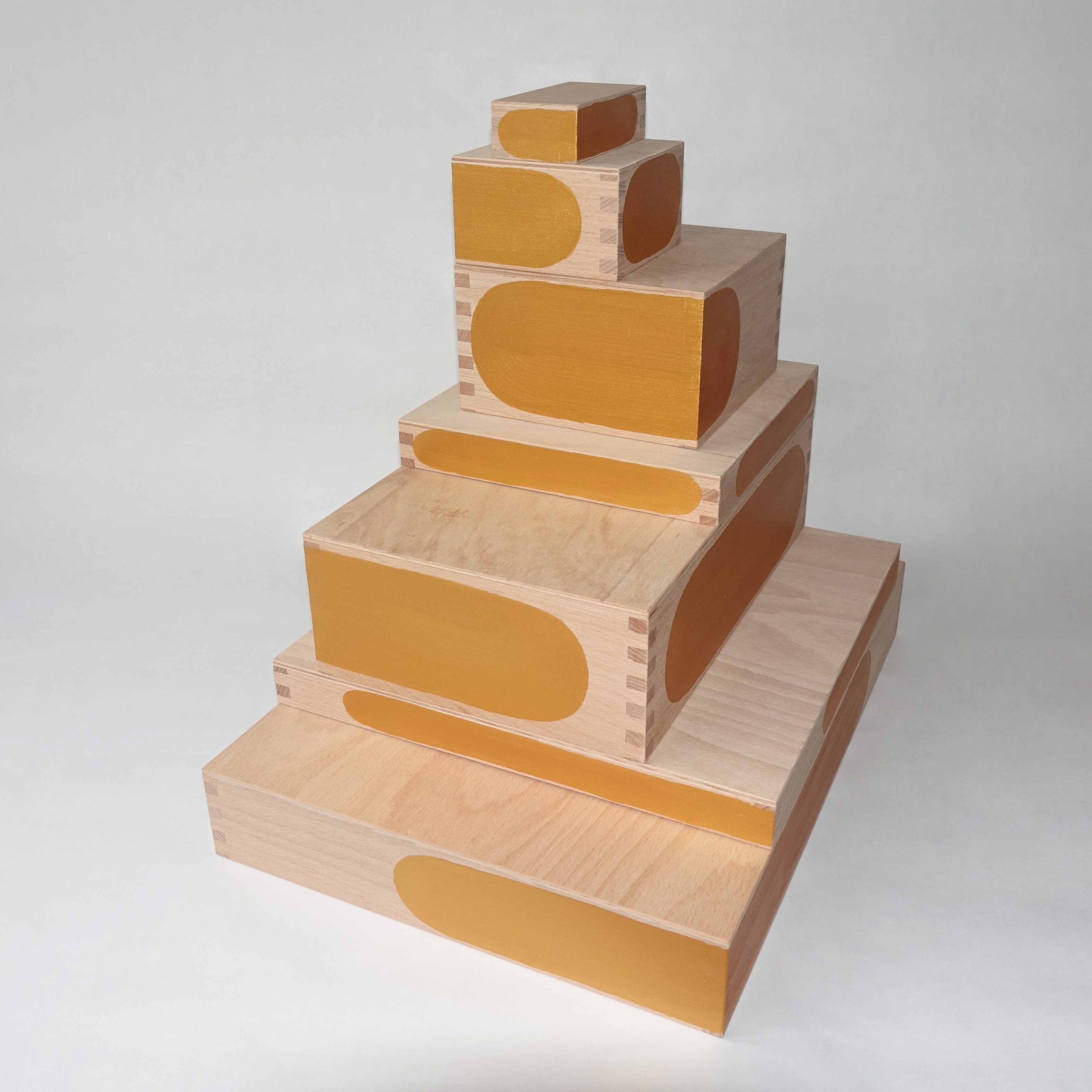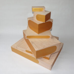7 boîtes façonnées en bois de hêtre de différentes dimensions (30 x 40 x 6 cm la plus grande – 5 x 10 x 3 cm la plus petite).